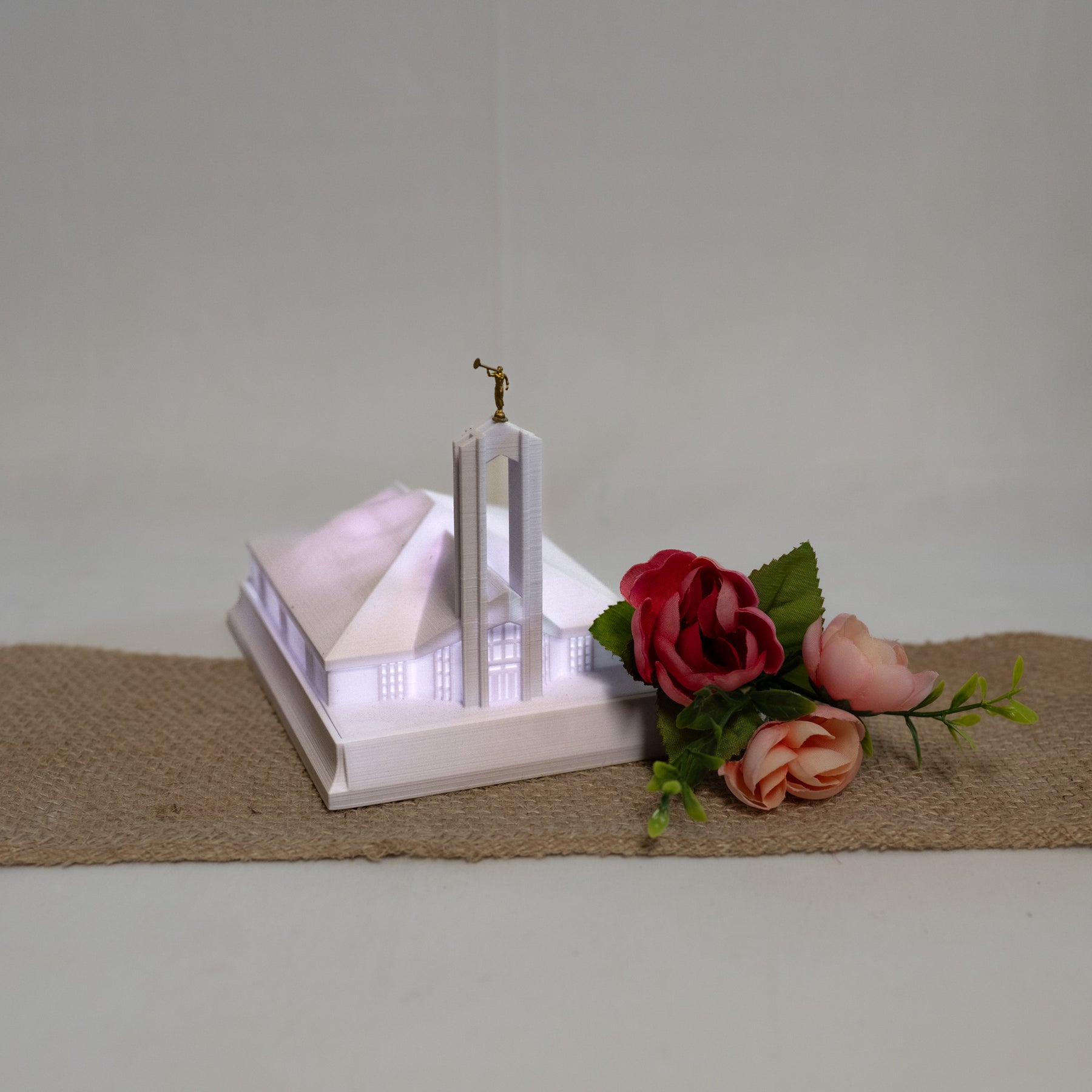 As designed, this temple features an Angel Moroni Statue and a miniature Angel Moroni will be included with your order of a medium, large, or extra large replica, or a music light. Small replicas are too small to successfully attach the miniature Angel Moroni.