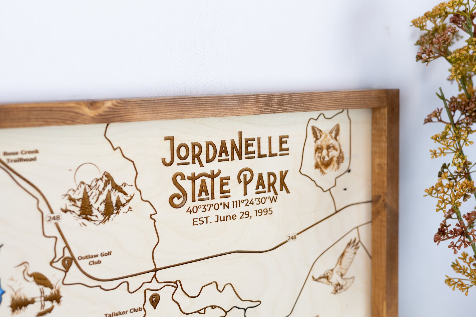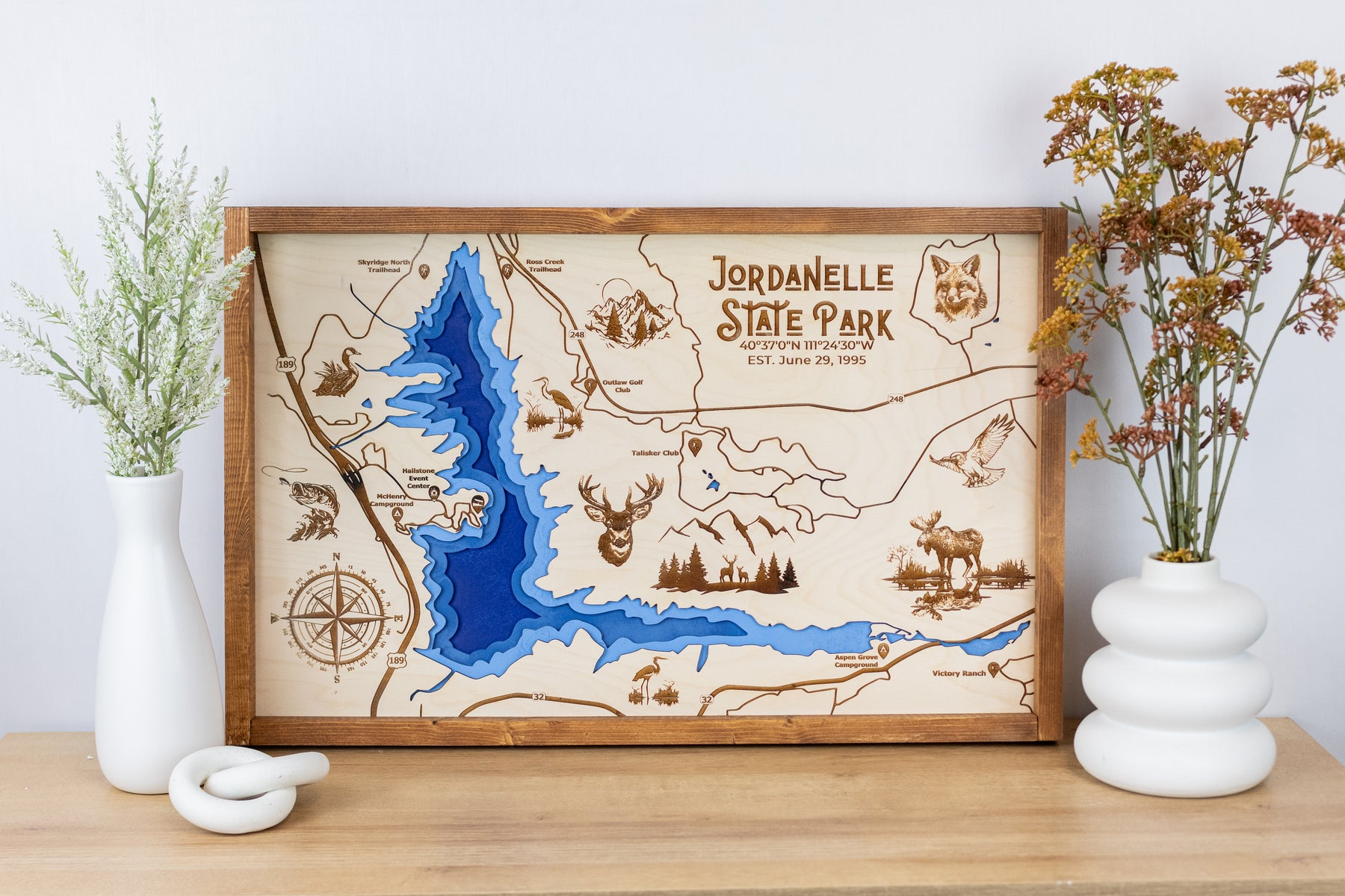 Bring the beauty of Jordanelle State Park into your home with this laser-engraved wooden sign, a stunning tribute to one of Utah’s most popular outdoor destinations. Featuring detailed topographic engravings of the reservoir, roads, campgrounds, and surrounding landmarks, this handcrafted piece is perfect for those who love boating, fishing, and exploring nature.