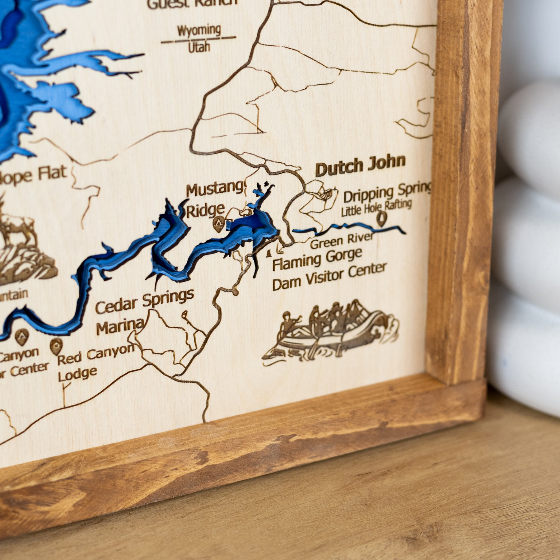 This handcrafted piece features precisely engraved details of the reservoir, roads, and key locations such as Lucerne Valley, Dutch John, and Antelope Flats. The hand-painted blue water inlay adds depth and realism, while engraved wildlife, including bighorn sheep, elk, and trout, brings the spirit of the outdoors to life.