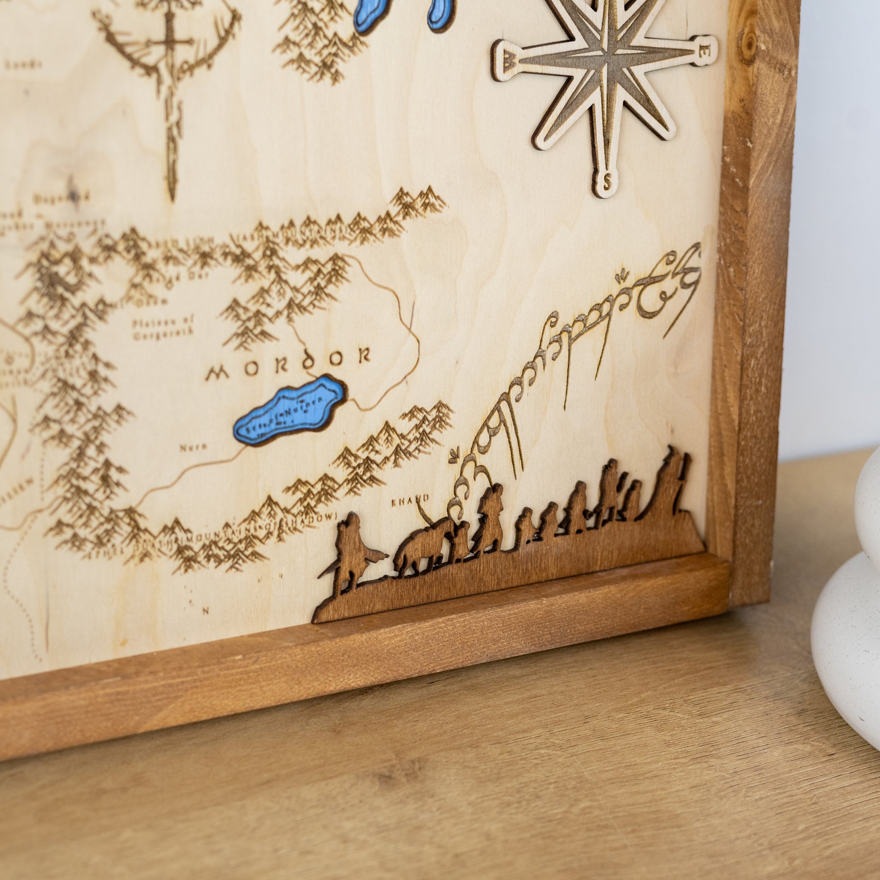 Designed with multi-layered cutouts and hand-painted blue water inlays, this sign adds depth and artistry to Middle-earth’s mythical geography. The engraved compass rose and elegant elven script details enhance its timeless fantasy aesthetic, making it a stunning centerpiece for any home, office, reading nook, or game room.