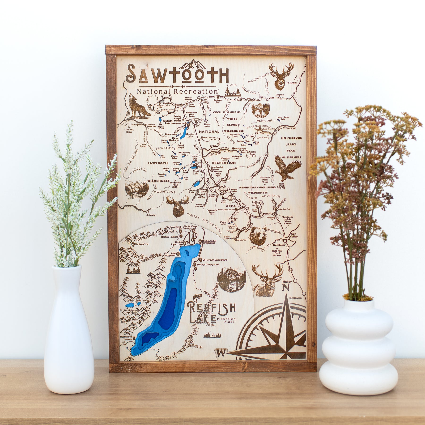 Celebrate the beauty of Sawtooth and the iconic Redfish Lake with this laser-engraved wood sign, meticulously crafted to showcase the natural landmarks, waterways, and terrain of this beloved outdoor destination.