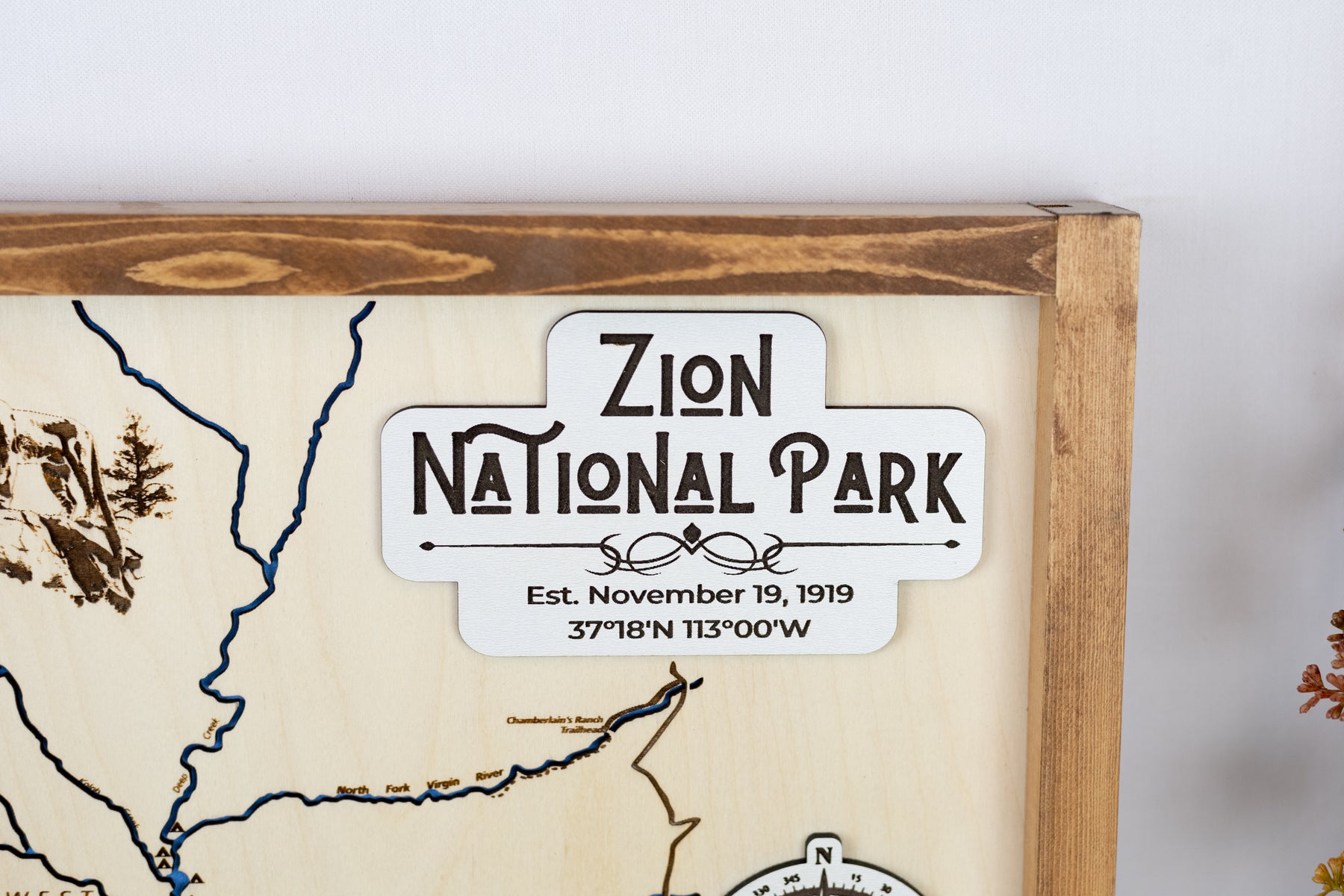 Bring the breathtaking landscape of Zion National Park into your home with this laser-engraved wood map, a perfect blend of art and geography. This detailed topographic sign showcases the park’s trails, rivers, roads, and key landmarks, all etched with precision.