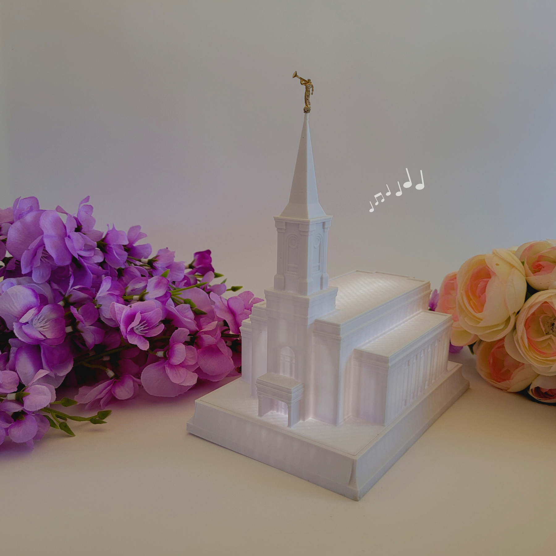 As designed, this temple features an Angel Moroni Statue and a miniature Angel Moroni will be included with your order of a medium, large, or extra large replica, or a music light. Small replicas are too small to successfully attach the miniature Angel Moroni.