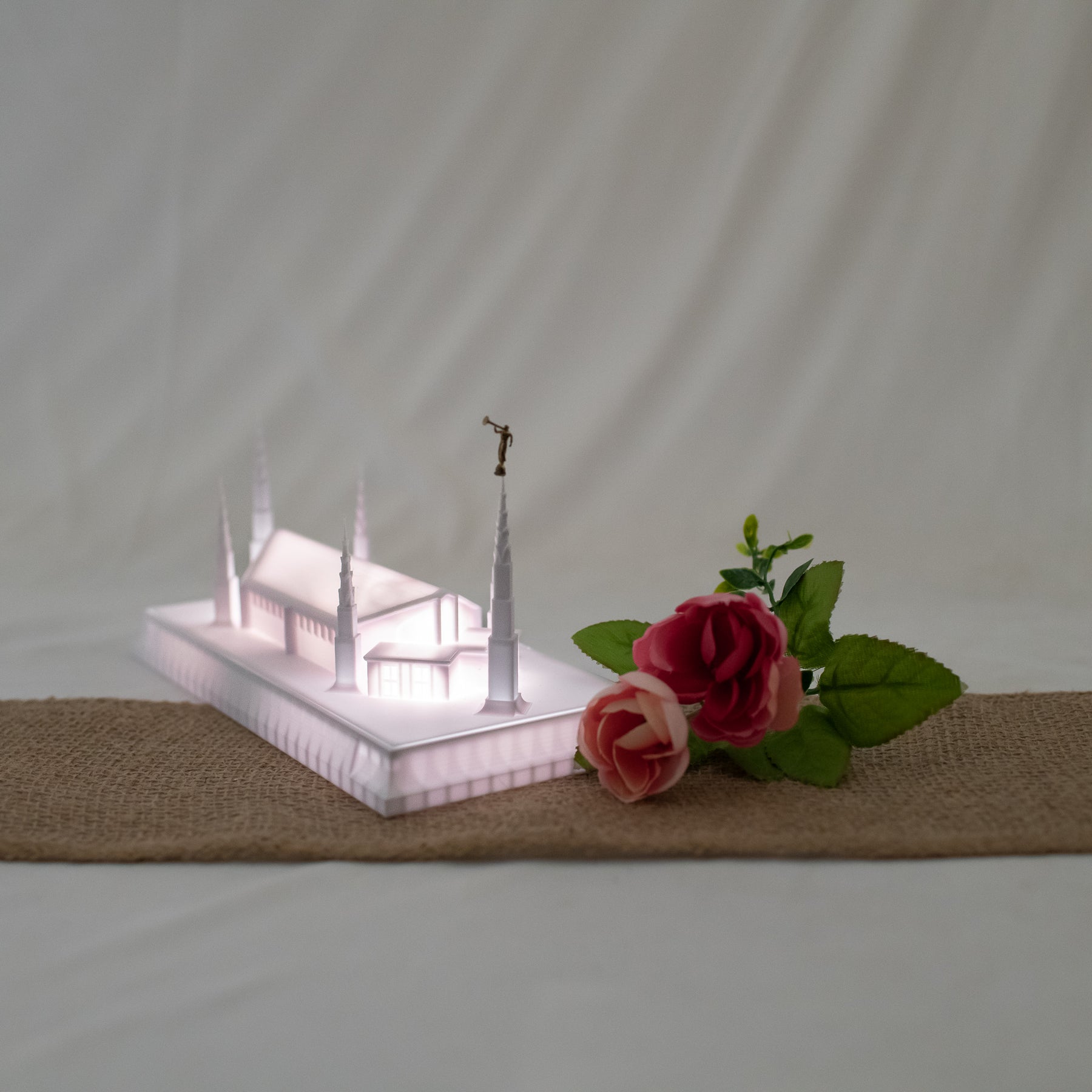 As designed, this temple features an Angel Moroni Statue and a miniature Angel Moroni will be included with your order of a medium, large, or extra large replica, or a music light. Small replicas are too small to successfully attach the miniature Angel Moroni.