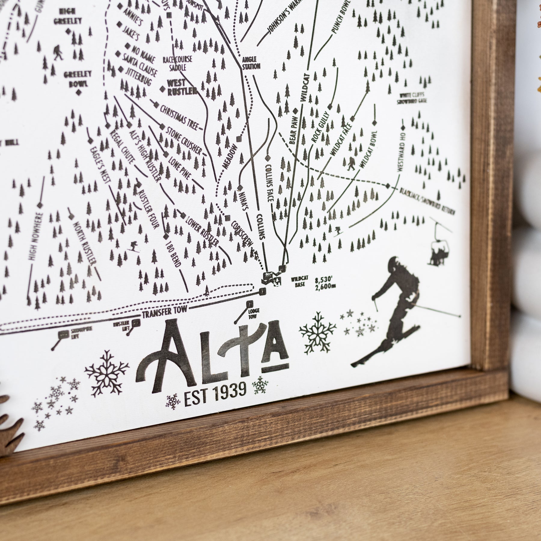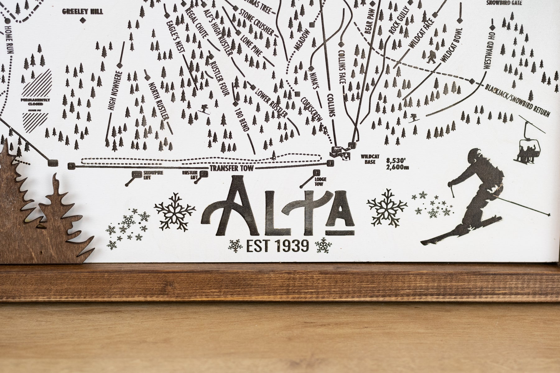 This handcrafted piece features precisely engraved details of Alta’s trails, lifts, and surrounding Wasatch peaks. The multi-layered Baltic birch and eucalyptus backdrop create a stunning 3D effect, while the dark wood-stained frame adds a rustic touch.