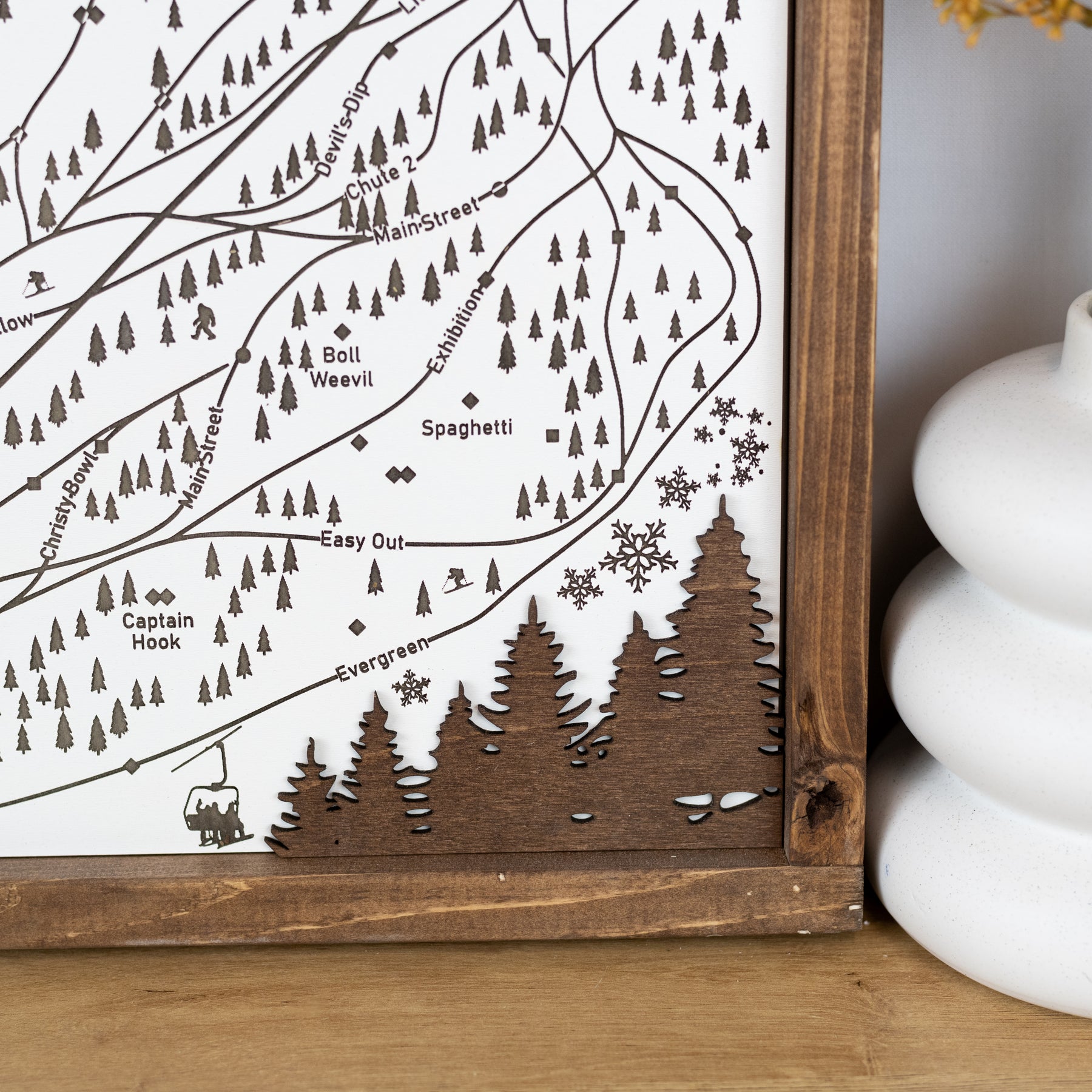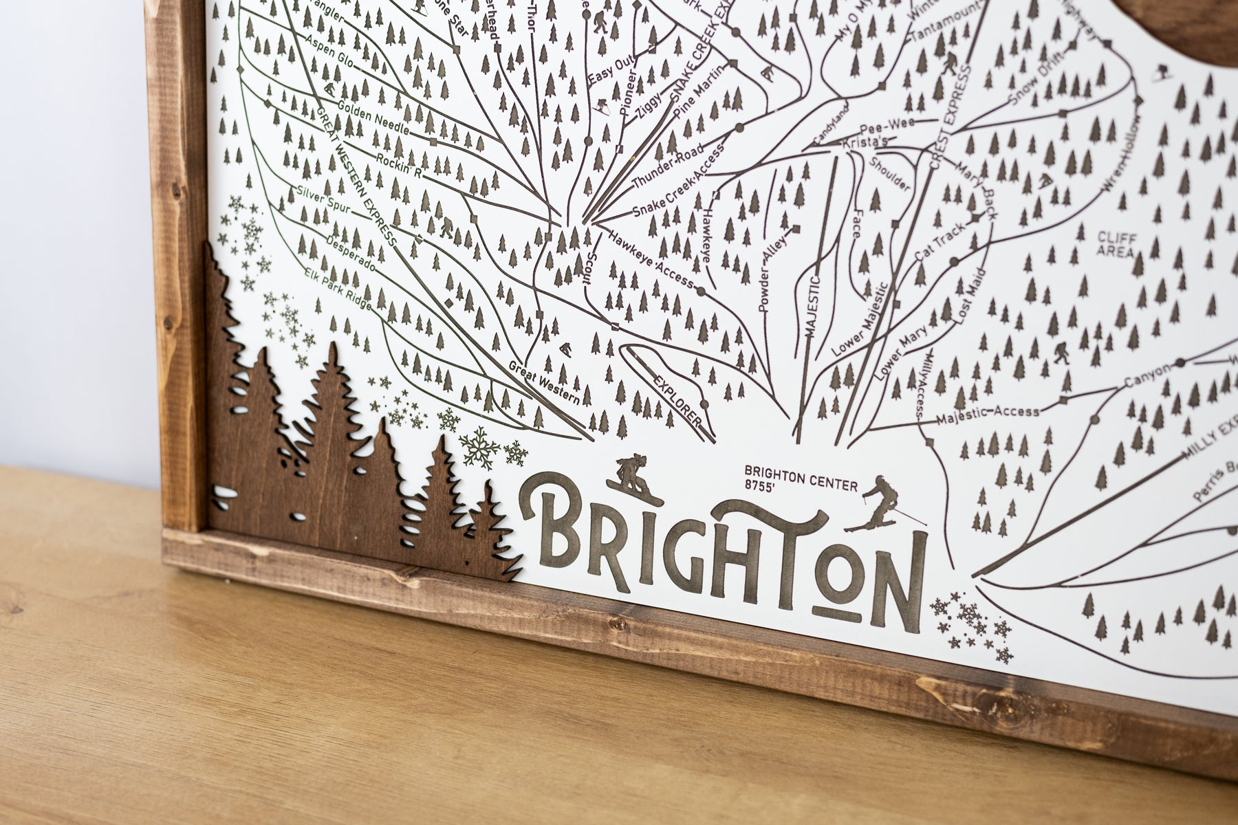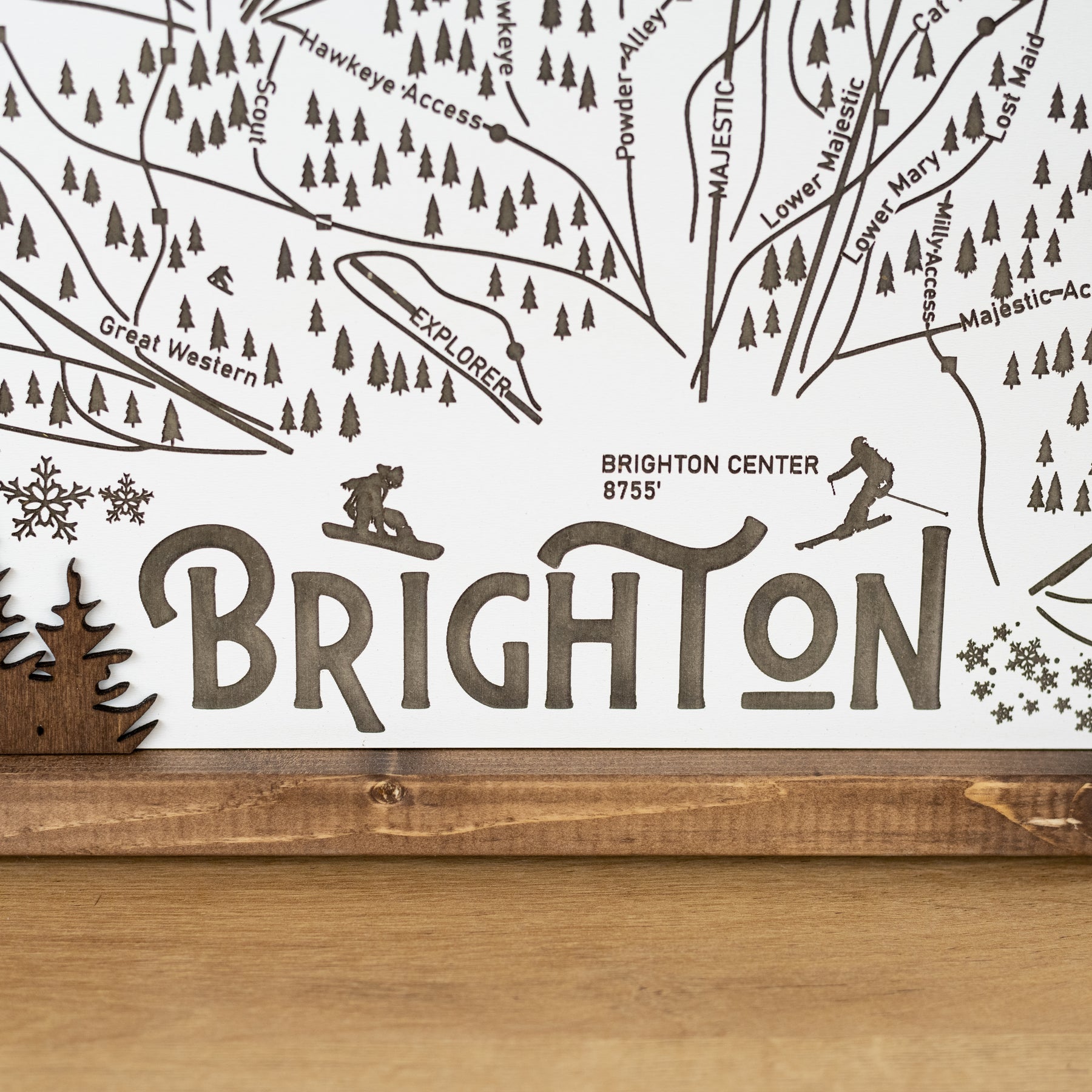 This handcrafted piece features precisely engraved details of Brighton’s trails, base areas, and surrounding Wasatch peaks. The multi-layered Baltic birch and eucalyptus backdrop create a striking 3D effect, while the rich wood stain adds warmth and character.