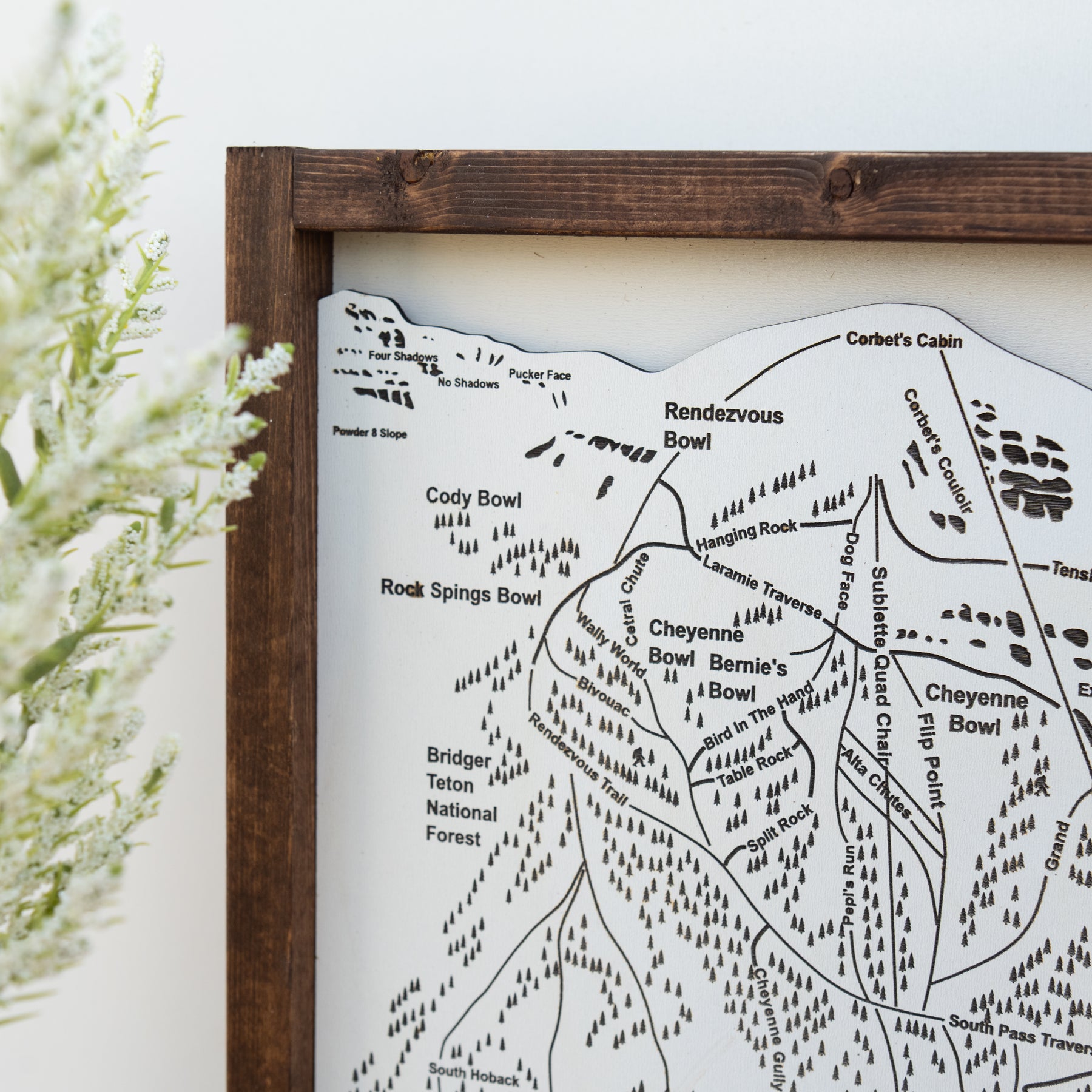 Bring the thrill of Jackson Hole Ski Resort into your home with this laser-engraved wooden ski trail map. Known for its family-friendly slopes, deep powder, and stunning mountain scenery, Jackson Hole is a beloved winter destination in North-Western Wyoming.