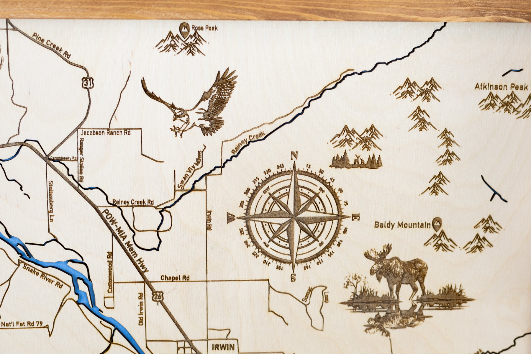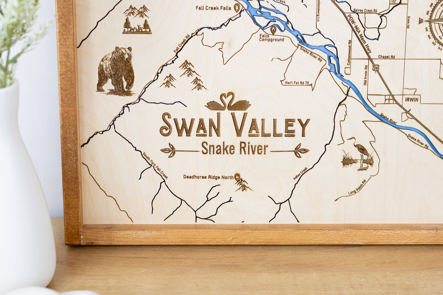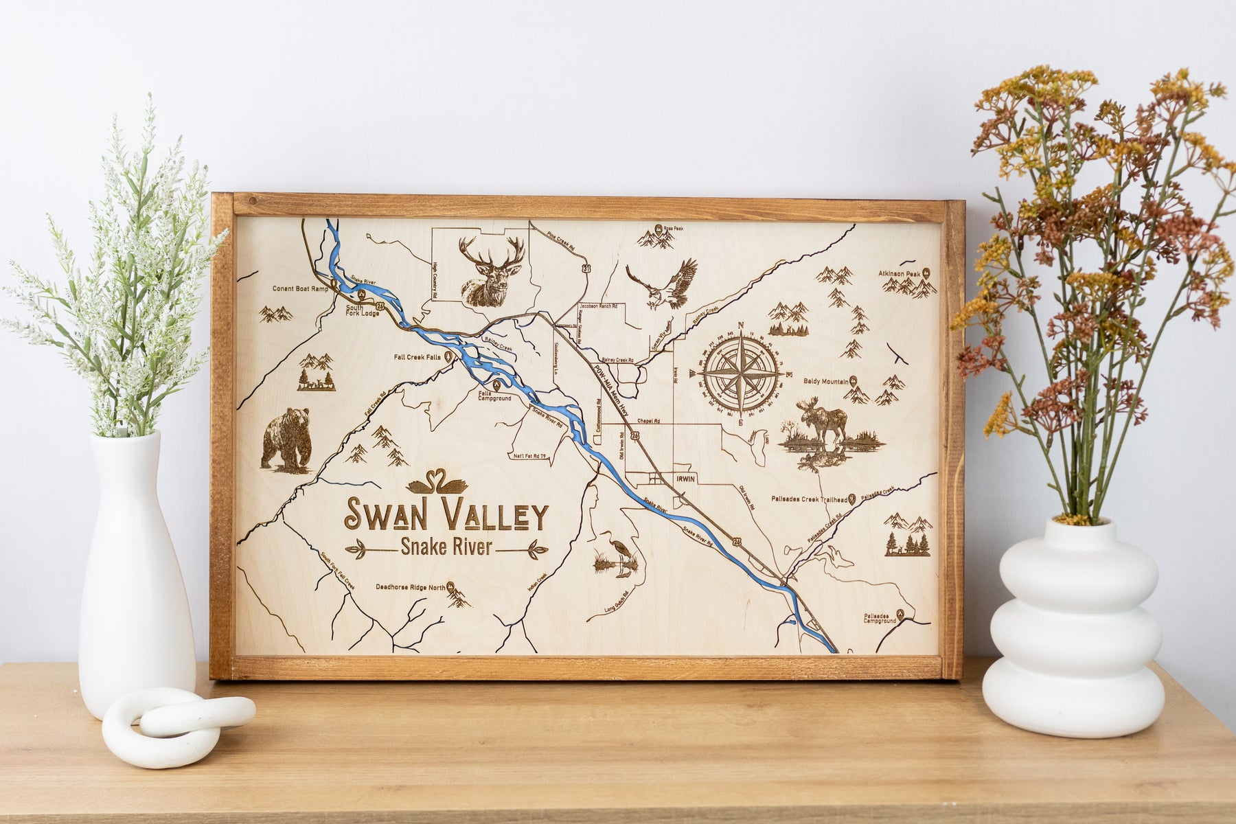Celebrate the beauty of Swan Valley and the iconic Snake River with this laser-engraved wood sign, meticulously crafted to showcase the natural landmarks, waterways, and terrain of this beloved outdoor destination.