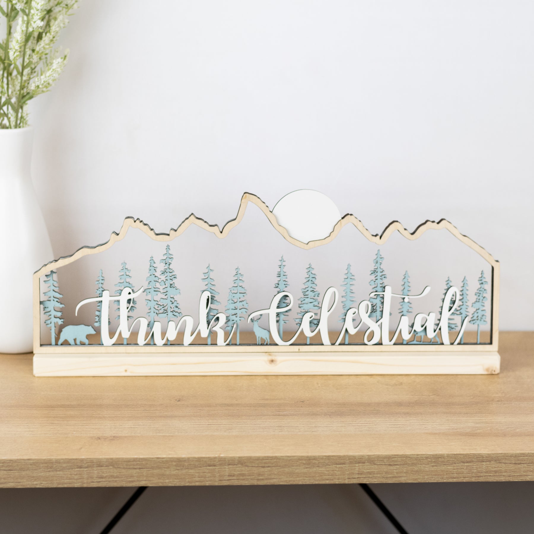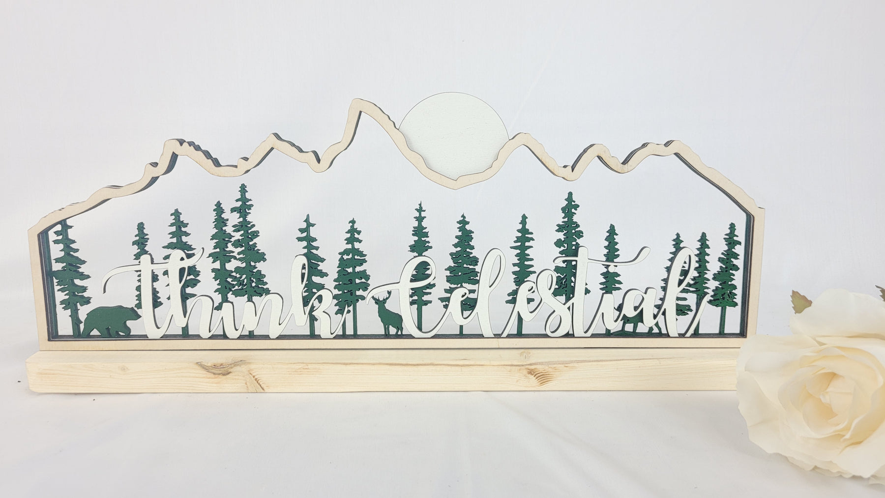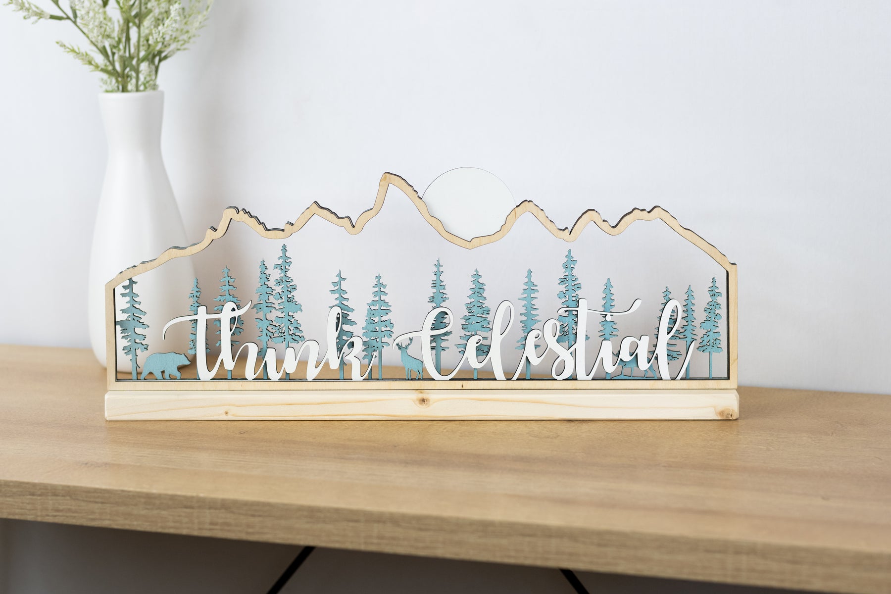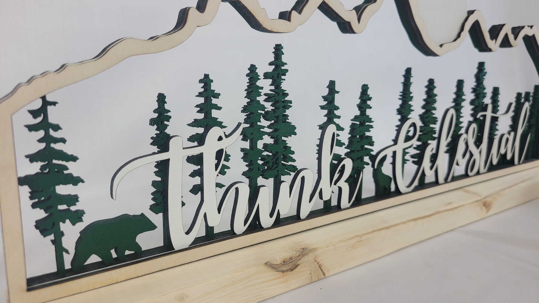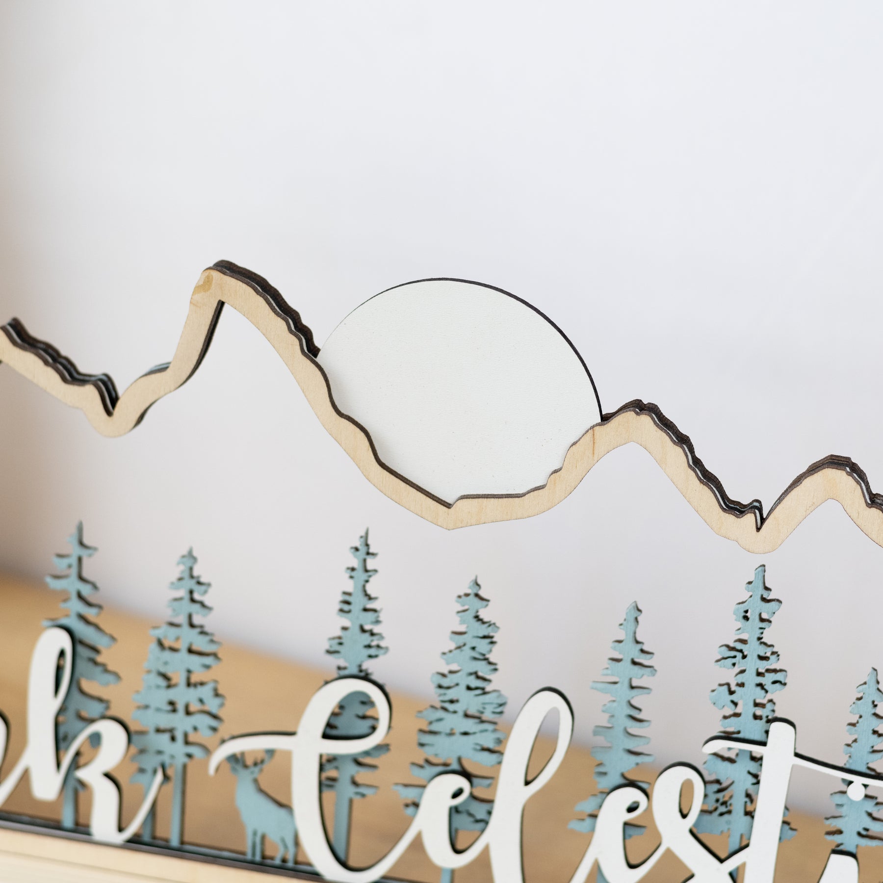 This piece captures the silhouette of the Teton mountain range as a frame to a forest of pine trees with hidden wildlife. Laser cut into 5 layers of various wood species.
