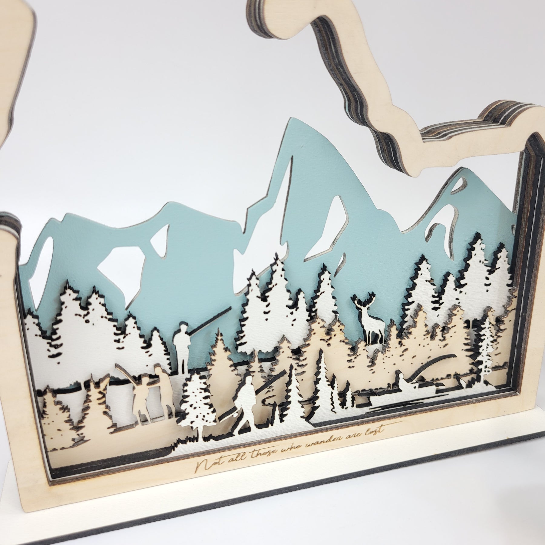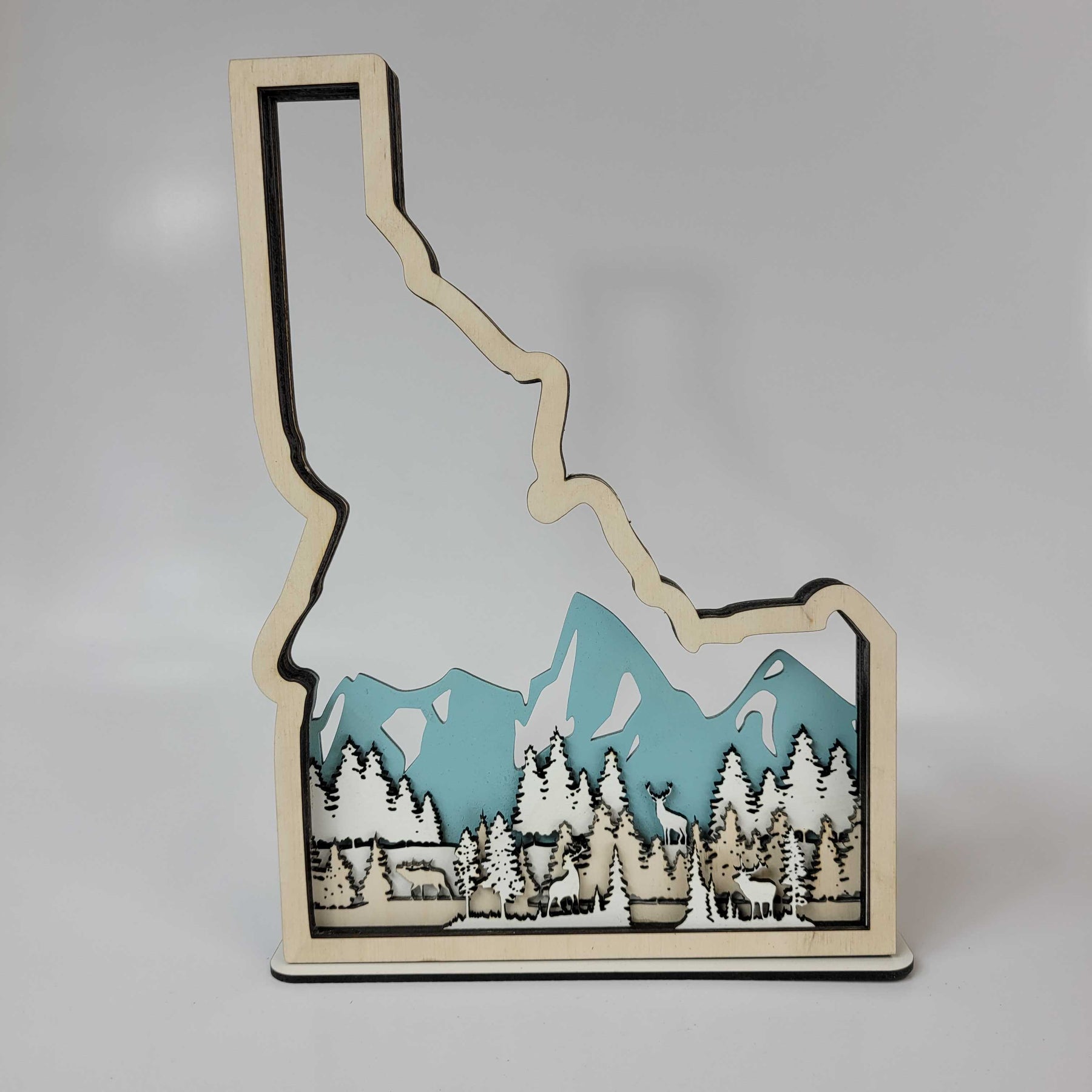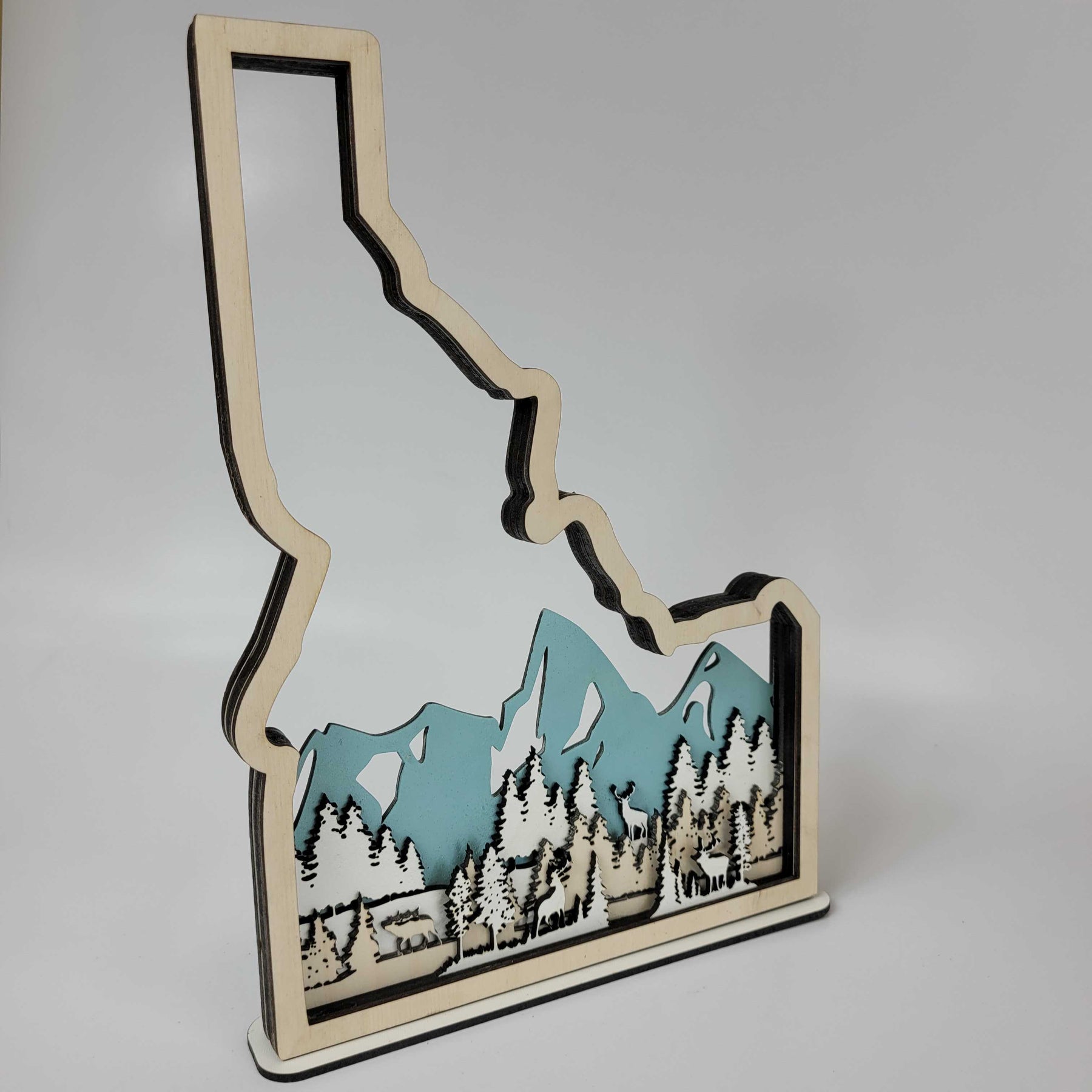 Made from 3-layers of 1/8" Baltic Birch and 3-layers of Eucalyptus White Hardboard. The mountains are painted a teal accent to complement the natural wood frame.