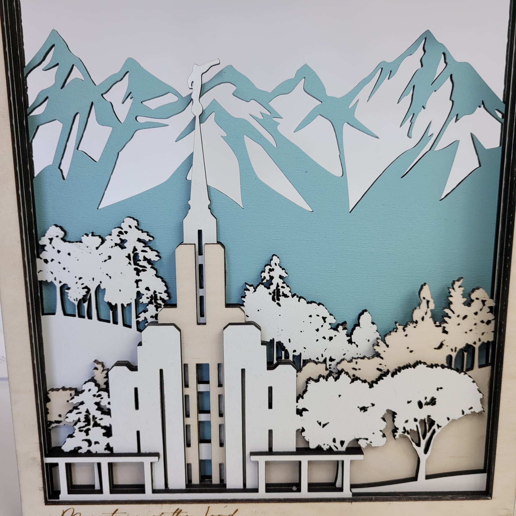 Made from 3-layers of 1/8" Baltic Birch and 3-layers of Eucalyptus White Hardboard. The mountains are painted a teal accent to complement the natural wood frame.